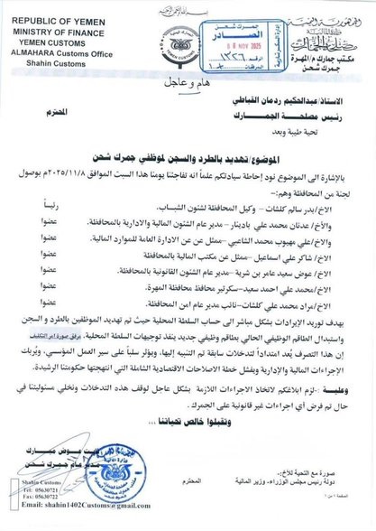 إدارة منفذ شحن سارعت إلى إرسال مذكرة تفصيلية إلى رئاسة مصلحة الجمارك في عدن، وصفت فيها الوضع بـ"الفوضى العارمة"، مشيرة إلى تهديدات مباشرة وتجاوزات قانونية تمس صلاحيات المصلحة.