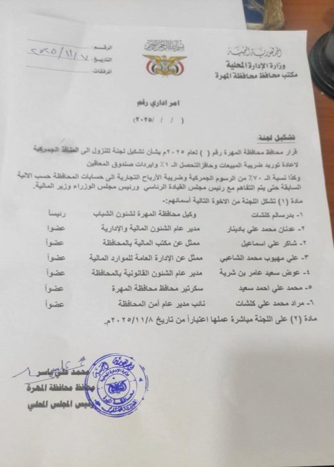 في تصعيد خطير يكشف عمق التوتر بين السلطة المركزية والسلطات المحلية في اليمن، أعلن محافظ محافظة المهرة رفضه الصريح لقرار مجلس القيادة الرئاسي رقم 11، وأصدر توجيهات باستخدام القوة لتحويل إيرادات منفذ شحن الحدودي إلى حساب السلطة المحلية، متجاوزًا صلاحيات مصلحة الجمارك وتوجيهات الحكومة المركزية.