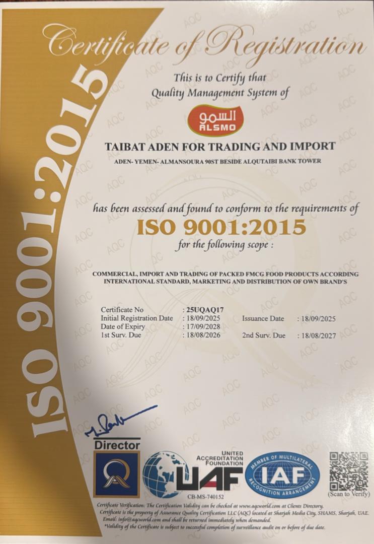 جددت شركة طيبات عدن للتجارة والاستيراد (السمو) اشتراكها في شهادتي نظام إدارة الجودة العالمية ISO 9001:2015 ونظام إدارة سلامة الغذاء ISO 22000:2018، تأكيداً لاستمرار التزامها بتطبيق المعايير الدولية في جميع أنشطتها التجارية والغذائية.
