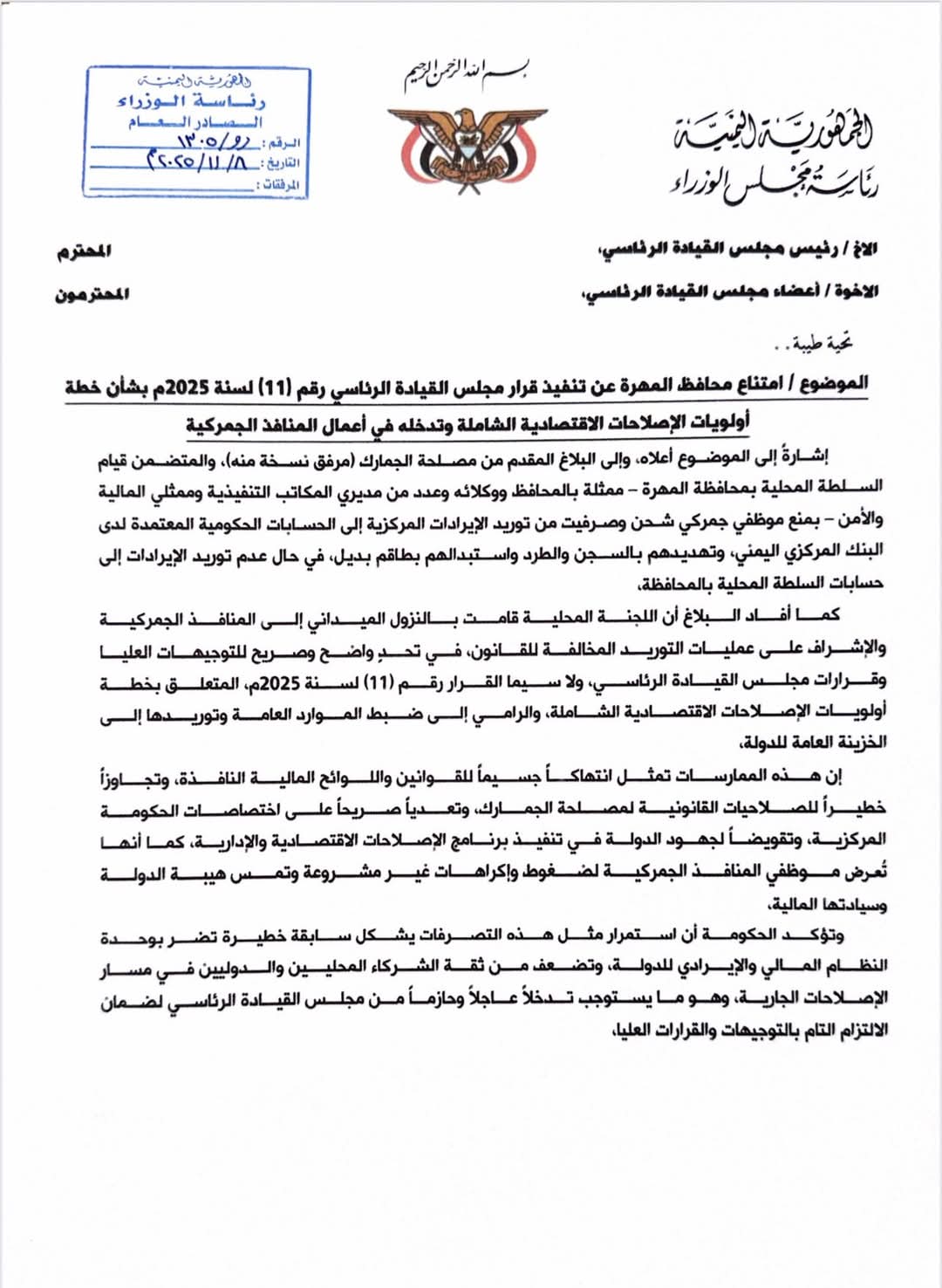 وجاء في مذكرة رئيس الوزراء أن محافظ المهرة امتنع عن تنفيذ قرار مجلس القيادة الرئاسي رقم (11) لسنة 2025، المتعلق بخطة أولويات الإصلاحات الاقتصادية الشاملة، وتدخل بشكل مباشر في أعمال المنافذ الجمركية، بما في ذلك جمركي شحن وصرفيت.
