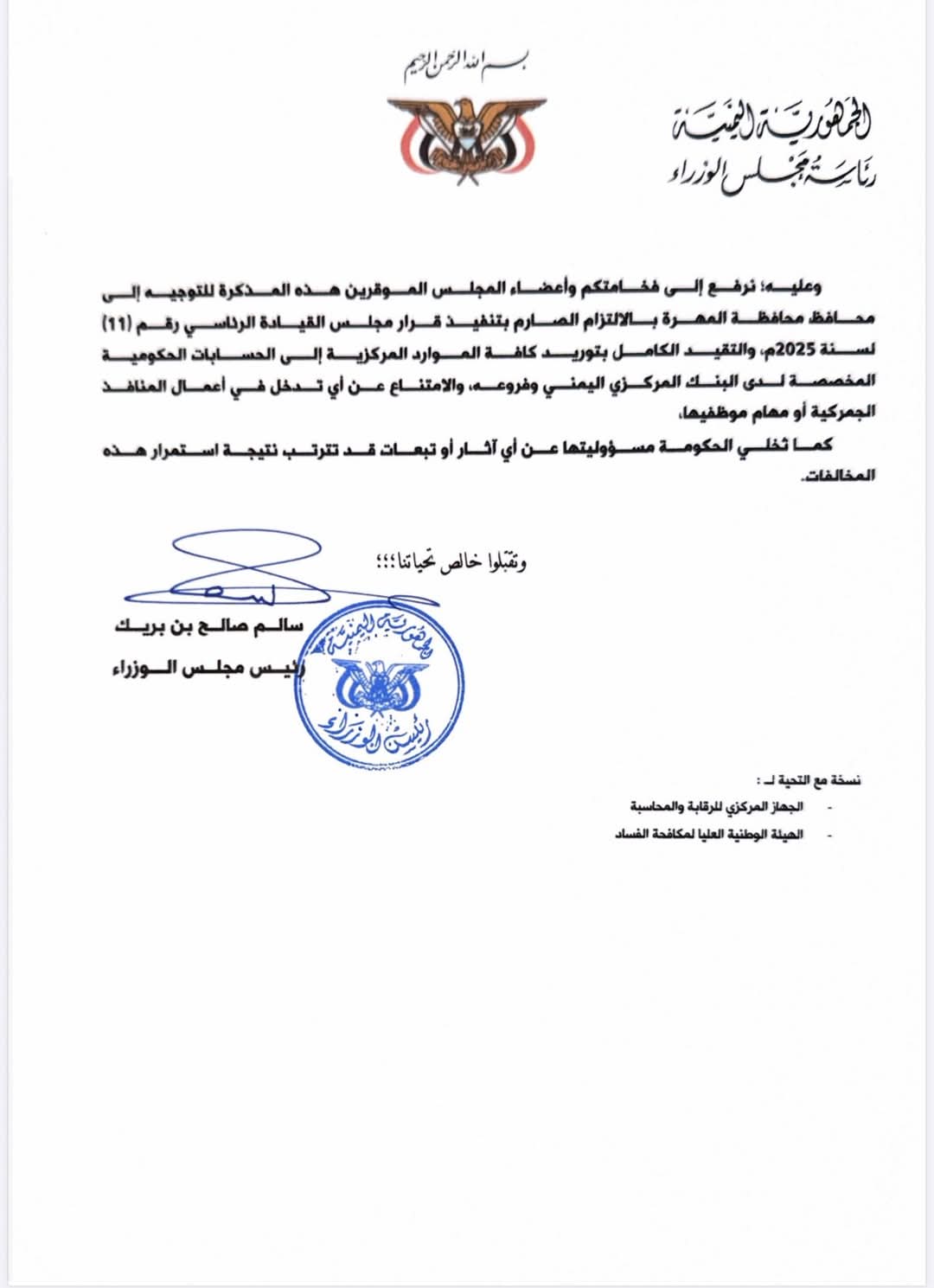 رفع رئيس الحكومة اليمنية، الدكتور سالم صالح بن بريك، مذكرة رسمية إلى رئيس مجلس القيادة الرئاسي، الدكتور رشاد العليمي، عبّر فيها عن رفضه لتصرفات محافظ محافظة المهرة، على خلفية توجيهاته بتحويل إيرادات منفذ شحن الحدودي إلى حساب السلطة المحلية، في مخالفة صريحة لقرارات الدولة المركزية.