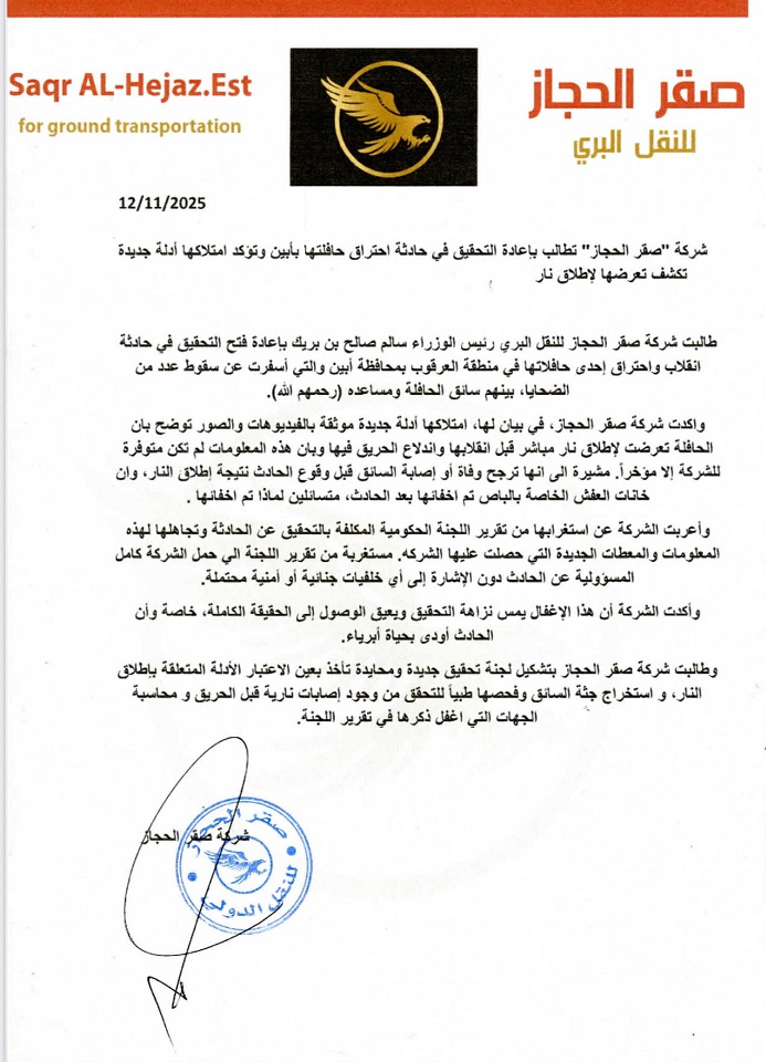 في المقابل، أعلنت اللجنة الوزارية المكلفة بالتحقيق إيقاف نشاط شركة صقر الحجاز مؤقتًا، بعد رصد ما وصفته بـ"قصور واختلالات فنية وتشغيلية"، مؤكدة أنها سترفع تقريرًا شاملًا إلى رئاسة الوزراء يتضمن نتائج التحقيقات والملاحظات الفنية وتوصيات لتعزيز السلامة في قطاع النقل.